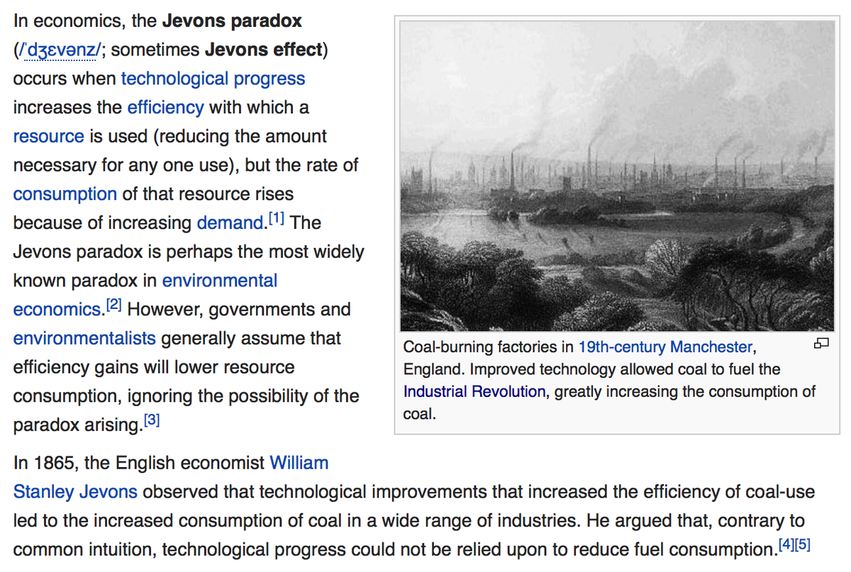 Jevons' paradox: tech increases efficiency => induced demand, *more* resource consumption https://en.wikipedia.org/wiki/Jevons_paradox … pic.twitter.com/XAeqaqWgxg