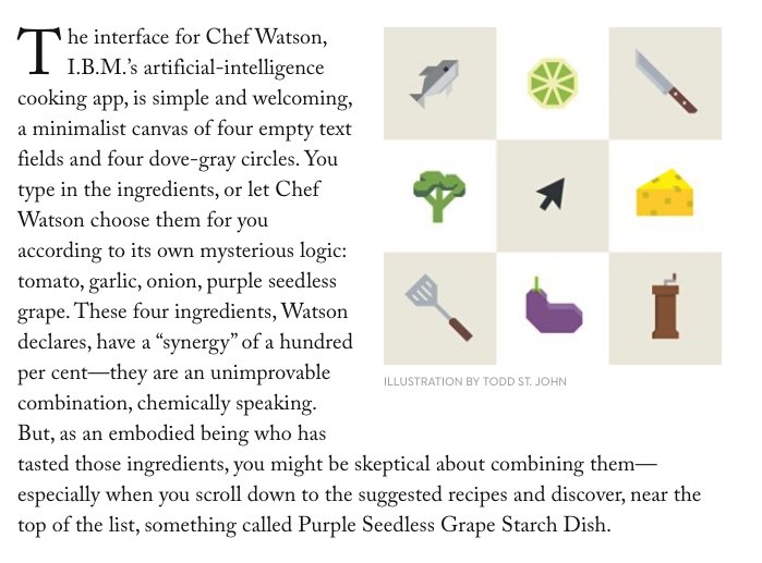 Cooking by AI: a correspondent tells me that Chef Watson is surprisingly good! http://www.newyorker.com/magazine/2016/11/28/cooking-with-chef-watson-ibms-artificial-intelligence-app …pic.twitter.com/TW1jVlptsk