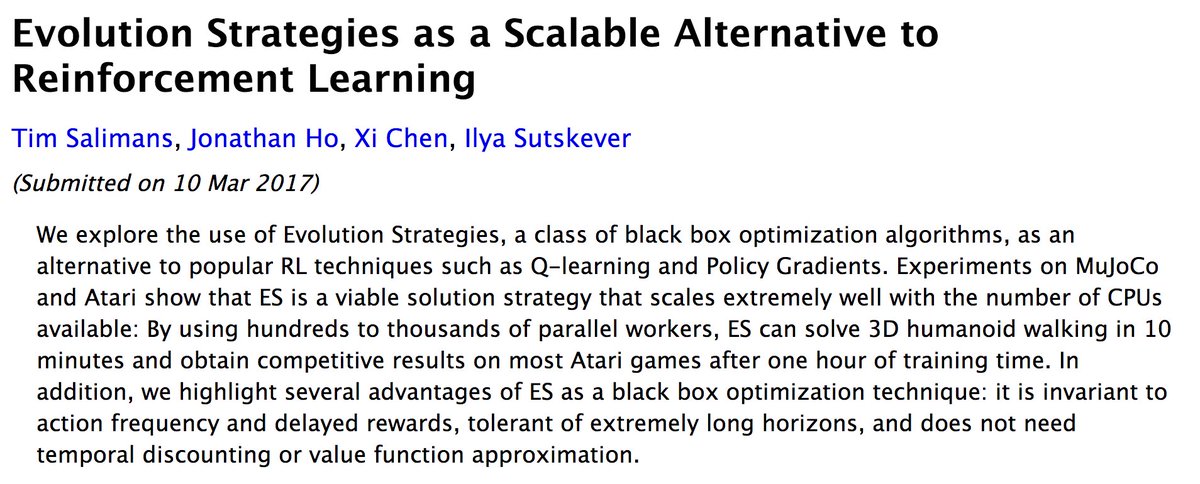 Easily scalable approaches to reinforcement learning, by @ilyasut & co. Interesting thing: the algorithm appears very simple, & v. powerfulpic.twitter.com/6RMbuQtBSW