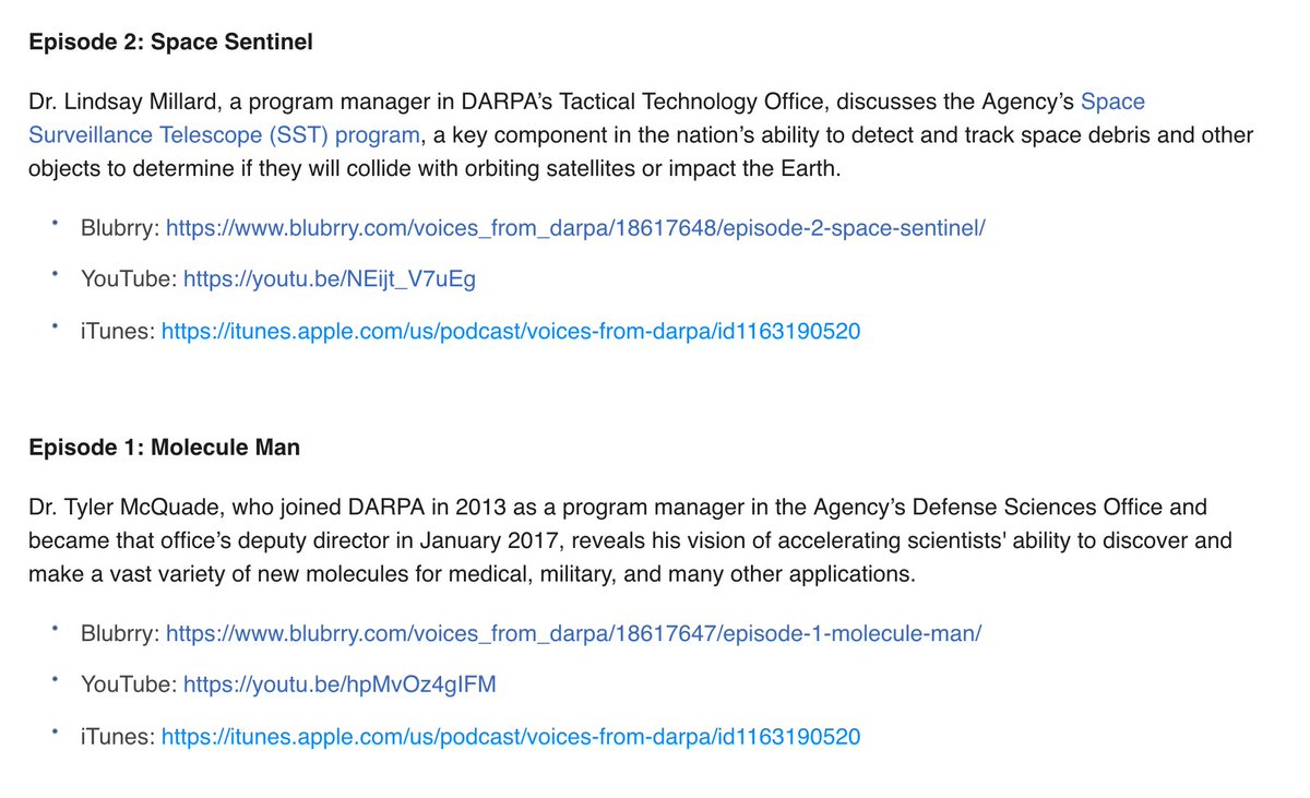 DARPA recently started a podcast interviewing program managers: http://www.darpa.mil/about-us/podcast …pic.twitter.com/I5ggO50r4j