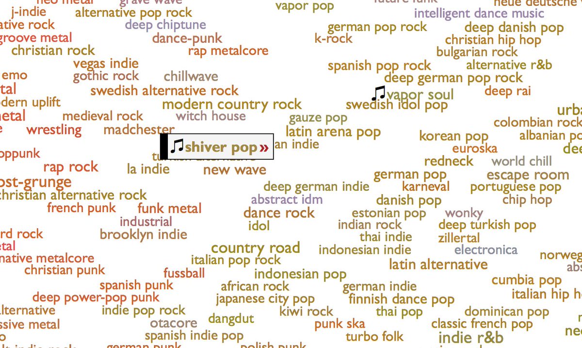 I've wanted this forever: Sample clips representing every musical genre http://everynoise.com/engenremap.html pic.twitter.com/T7FbeihBQW