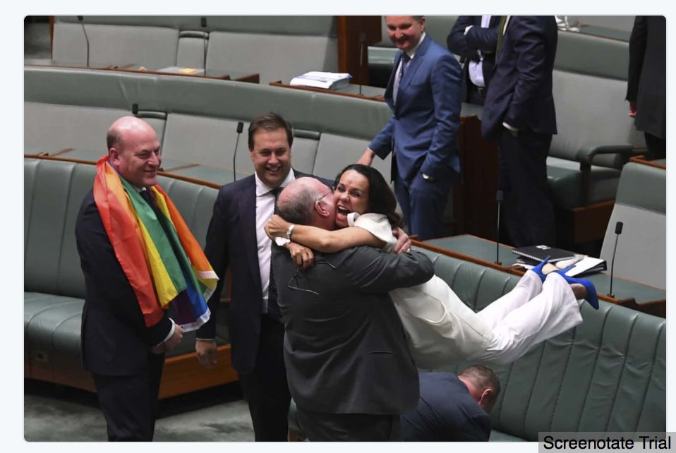 Pausing to interrupt the usual political doldrums... the Australian parliament just voted overwhelmingly (4 no votes, in total) to legalize gay marriage