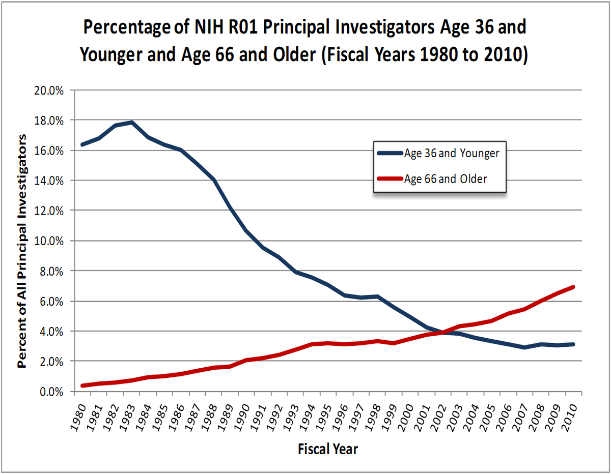 Fascinating graph of age of R01 NIH grant awardees. What I find fascinating: between 1998 and 2003 the NIH budget roughly doubled. Yet it made no discernible difference to the graph. It's not the amount of money which drives this, contra almost everyone. https://nexus.od.nih.gov/all/2012/02/13/age-distribution-of-nih-principal-investigators-and-medical-school-faculty/ …pic.twitter.com/WOul0KBqTJ