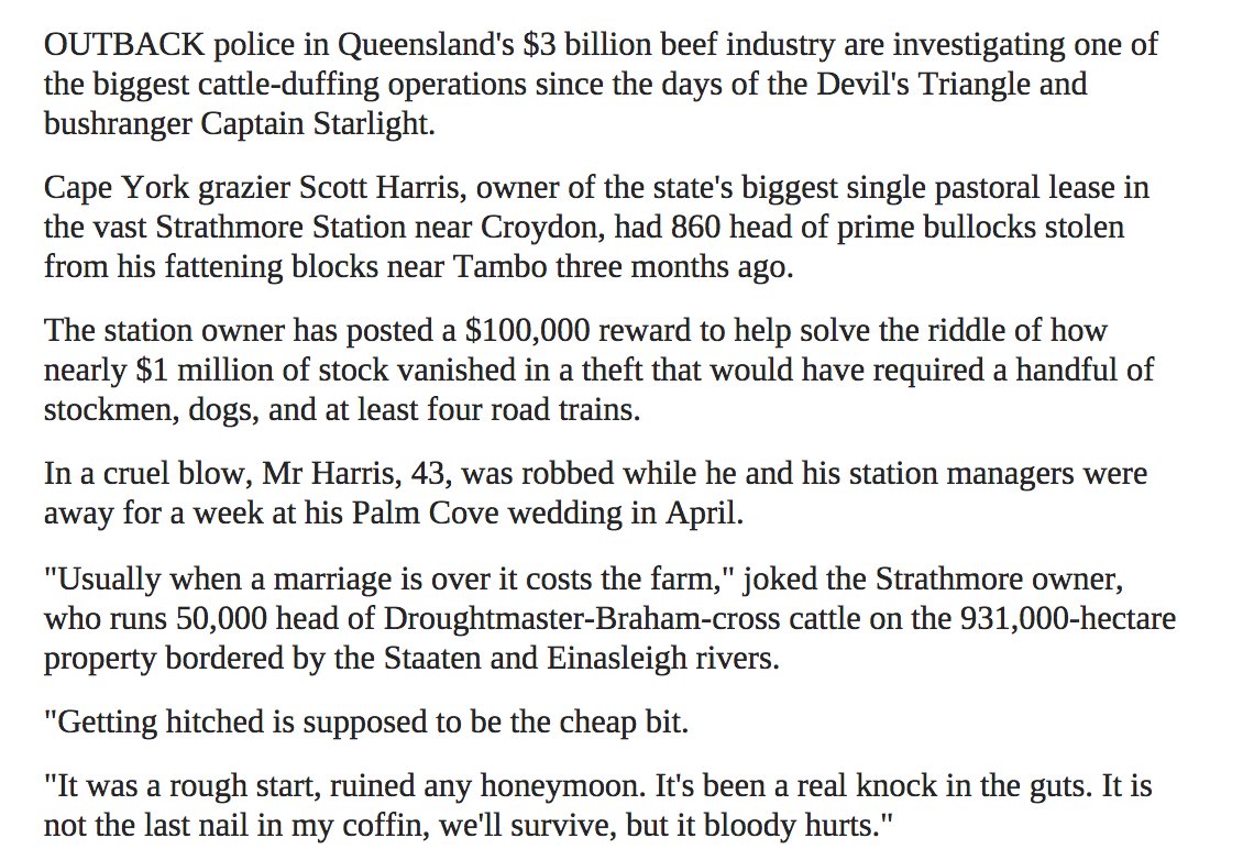 More cattle stealing, this time while a rancher was away getting married ("getting hitched is supposed to be the cheap bit"): http://www.news.com.au/national/queensland/cattle-herd-vanishes-in-devils-triangle/news-story/aee9820a97930fc426c9f50c3cbf0e3f …pic.twitter.com/rVvwpQTvPj