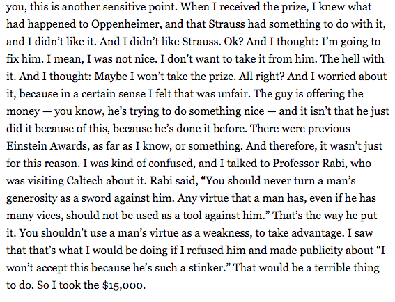 Related to Rabi to Feynman: "Never use a man's generosity as a sword against him."https://twitter.com/michael_nielsen/status/672113191200169984 …