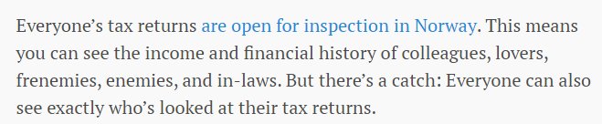 Can't stop thinking about this. "In Norway you can see anyone’s taxes, but there's a catch" http://qz.com/784186/in-norway-you-can-browse-everyones-tax-returns-but-theres-a-good-reason-you-might-not-want-to/ …pic.twitter.com/ySx2kzfa9D