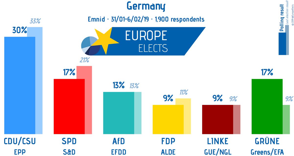 Germany, Emnid poll: CDU/CSU-EPP: 30% (+1) GRÜNE-G/EFA: 17% (-1) SPD-S&D: 17% (+1) AfD-EFDD: 13% (-2) FDP-ALDE: 9% (-1) LINKE-LEFT: 9% (+1) +/- vs. 24-30 Jan. '19 Field work: 31/01/19 – 6/01/19 Sample size: 1,900 ➤ http://europeelects.eu/germany pic.twitter.com/XXP5rszdRq