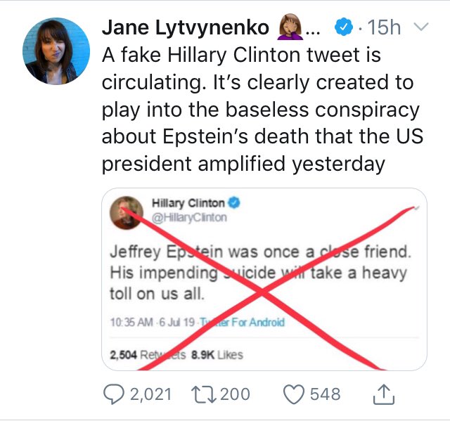 A fake Hillary Clinton tweet is circulating. It’s clearly created to play into the baseless conspiracy about Epstein’s death that the US president amplified yesterdaypic.twitter.com/b2VRf1s2t2