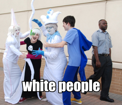 White kids engaging in fantasy as a working class black man looks on in disbelief is the best analogy.