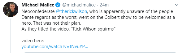 Neoconfederate @therickwilson, who is apparently unaware of the people Dante regards as the worst, went on the Colbert show to be welcomed as a hero. That was not their plan. As they titled the video, "Rick Wilson squirms" video here: https://www.youtube.com/watch?v=tNvuYPpX0C0&feature=emb_title …pic.twitter.com/0q4wZsknK5