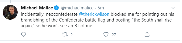 incidentally, neoconfederate @therickwilson blocked me for pointing out his brandishing of the Confederate battle flag and posting "the South shall rise again," so he won't see an RT of me.