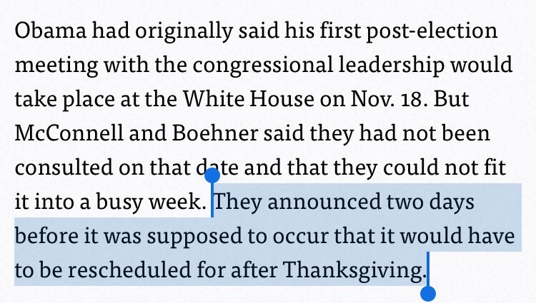 Oh look, here’s another meeting with President Obama that McConnell brushed off - the first meeting after the 2010 midterms. Reading this brought back memories of the pettiness of GOP leaders & the wide variety of ways they found to disrespect Obama. 1/ https://www.politico.com/story/2010/11/gop-leaders-finally-meet-obama-045710 … pic.twitter.com/5Gd9W1O1XJ