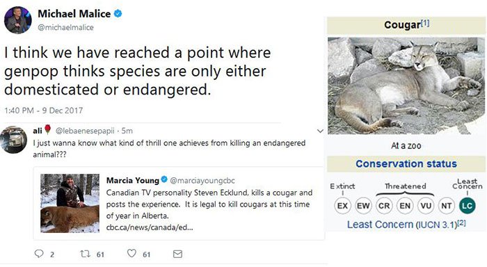Terrifying isn't it? I want to have a true conversation with someone who believes cougars and other non endangered animals are endangered. Where do these people get their information?
