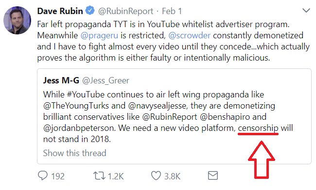 Apparently YouTube demonetization is 'censorship', a twitter display bug is 'censorship', the memo exposed a 'massive scandal', and Rose McGowan is 'the left'. Dave Rubin = conspiracy theorist & Trump shill @RubinReportpic.twitter.com/VQ0JoMbxeQ