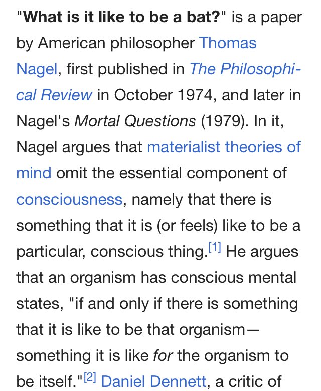 Your "imagine being this person" is like an updated version of "What is it like to be a bat?" It somehow makes the point even better than the original thought experiment. https://en.wikipedia.org/wiki/What_Is_it_Like_to_Be_a_Bat …pic.twitter.com/yhlhlOrDFF
