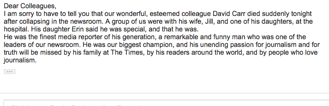 Oh non! Le légendaire @carr2n n'est plus RT@michaelroston: Dean Baquet on David Carr: “He was our biggest champion…"pic.twitter.com/GGwv0Z75J8