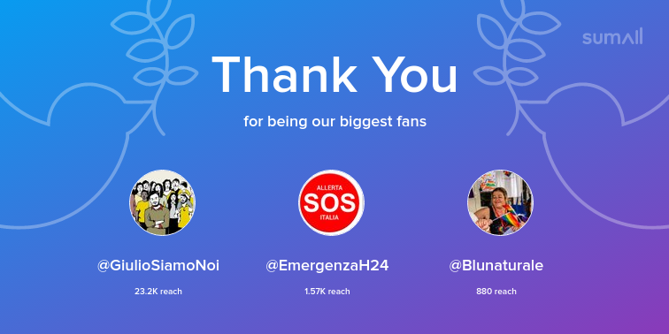 Our biggest fans this week: GiulioSiamoNoi, EmergenzaH24, Blunaturale. Thank you! via https://sumall.com/thankyou?utm_source=twitter&utm_medium=publishing&utm_campaign=thank_you_tweet&utm_content=text_and_media&utm_term=9dbfb318a823cbb4f68510c1 …pic.twitter.com/qU2jewItrV