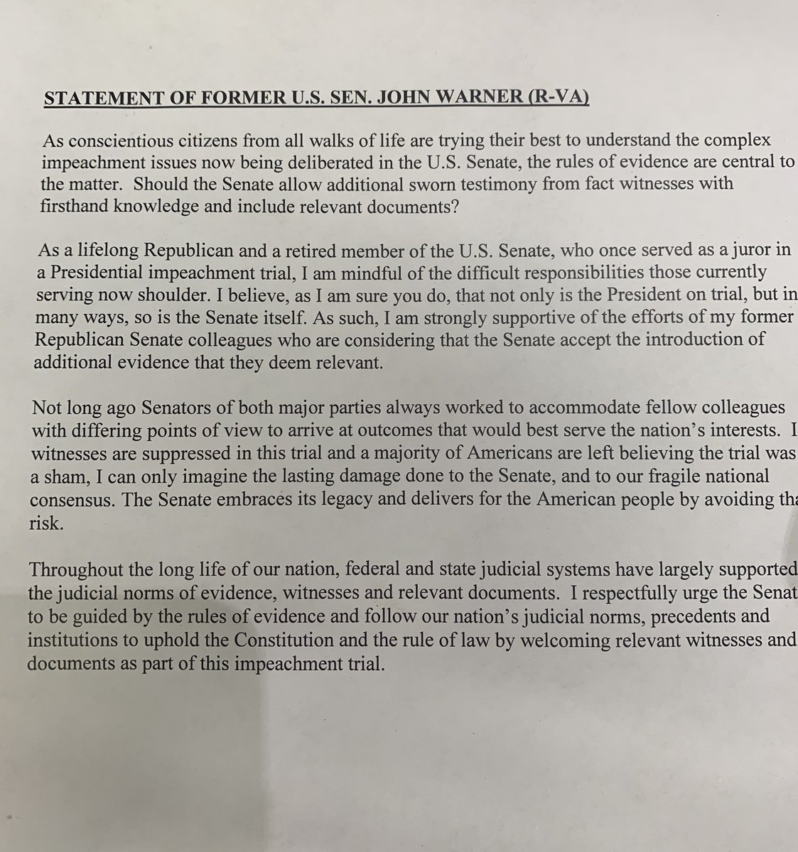 NEW: Former Senator John Warner, a Republican and elder statesman of Virginia politics, has issued a statement calling on fellow Republicans to follow “judicial norms” by “welcoming relevant witnesses and documents” in President Trump’s impeachment trial.pic.twitter.com/GeRRjIkHfo