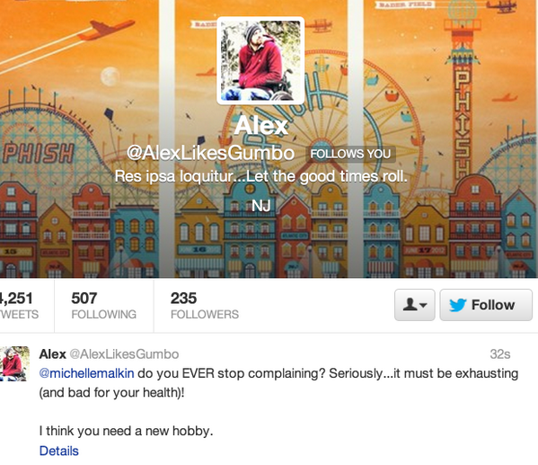 @michellemalkin@alexlikesgumbo I don't get why people would follow someone they can't stand. You rock, Mrs. Malkin!!Thanks. Twitter will use this to make your timeline better. UndoUndo