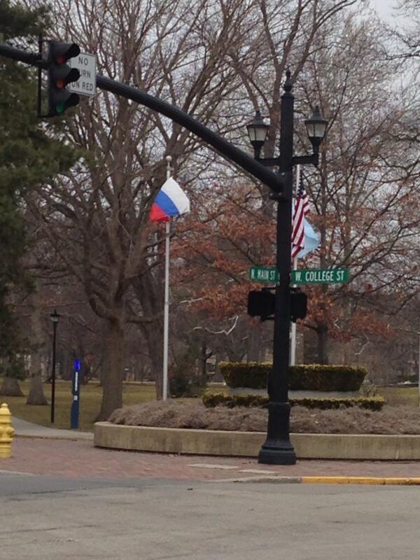 Why is the Russian flag flying on the Oberlin campus? The blue one is the UN flag @michellemalkinpic.twitter.com/MML22Hk4GW