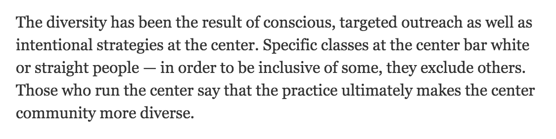 @michellemalkin "Specific classes at the center bar white or straight people — in order to be inclusive of some, they exclude others."