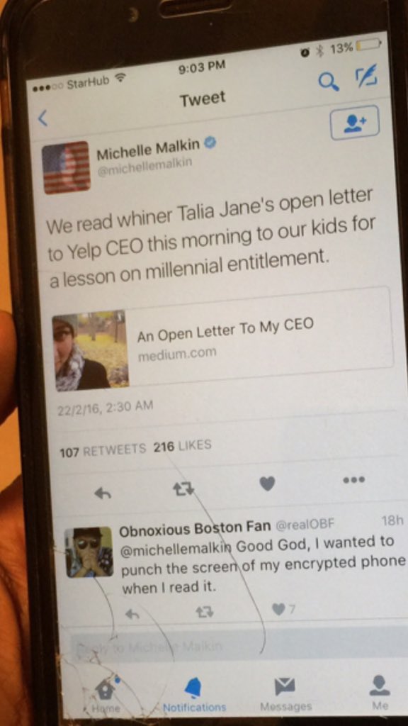@michellemalkin a millenial's opinion on this - we're not all whiners. https://medium.com/@StefWilliams25/an-open-letter-to-millenials-like-talia-52e9597943aa#.s2hfuojsk …