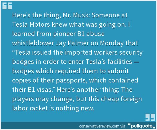Our GOVERNMENT IS SUBSIDIZING TESLA... yet, Tesla is IMPORTING workers??? Are you Kidding me?