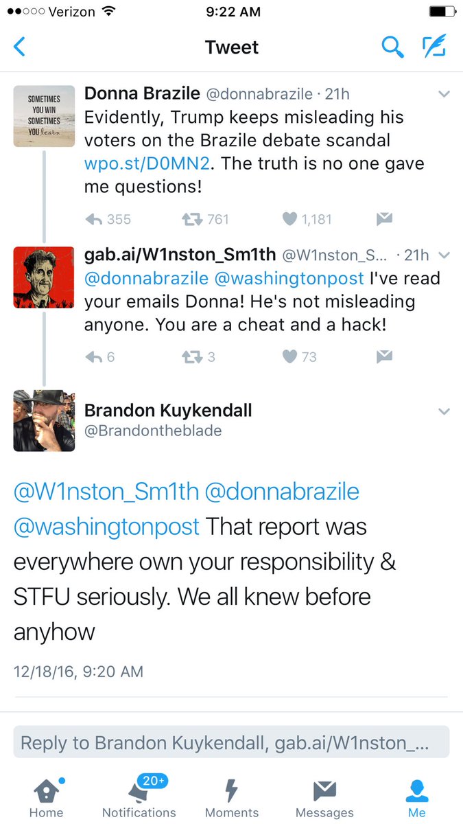 - @donnabrazile blocks people she doesn't want to hear from. She like living in her echo chamber.