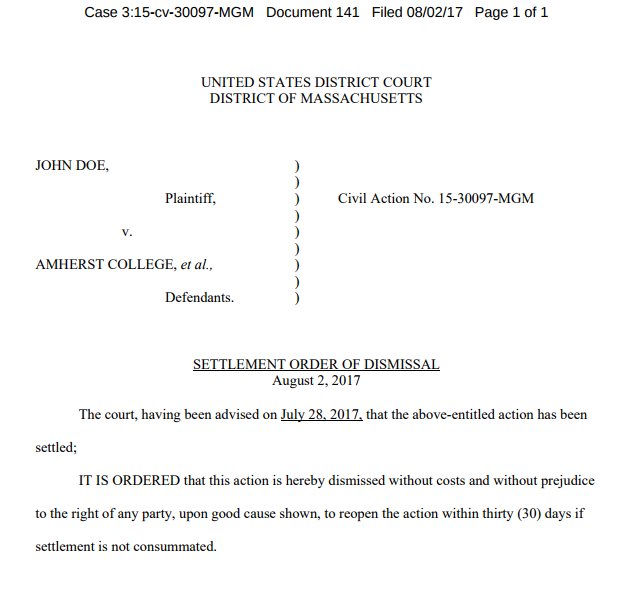 Just in: settlement in @AmherstCollege case, perhaps the most egregious of any of the post-Dear Colleague letter Title IX cases.pic.twitter.com/sAiNUTq5FJ