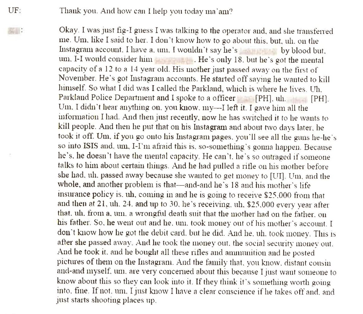 Link to the entire FBI Transcript of Jan report on Nikolas Cruz. http://online.wsj.com/public/resources/documents/FBI-transcript-02-23-2018.pdf …