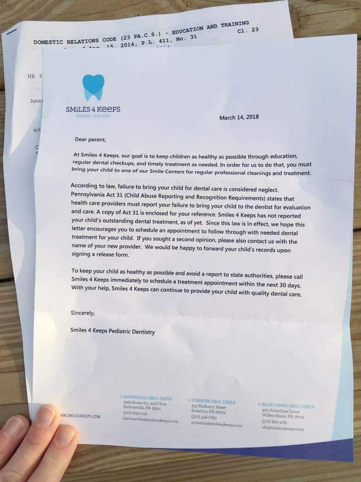 Here's a letter a parent received from their child's dentist, threatening a missed cleaning appt as abuse!pic.twitter.com/5EXSIvMF6A