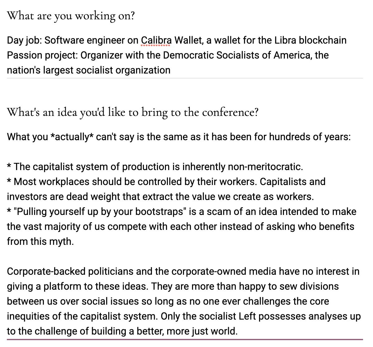 IMO, I think a talk about hardcore socialism at a VC event is pretty out there and you never know, we might consider it. Don’t assume what we will and won’t allow. Submit!https://twitter.com/jasonpjason/status/1179209290499837952 …