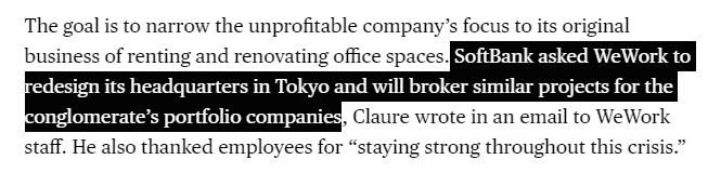 To help WeWork achieve profitability, Softbank itself will become a WeWork client, and it will encourage its other portfolio companies to become WeWork clients. pic.twitter.com/p4zDgmU4Nj