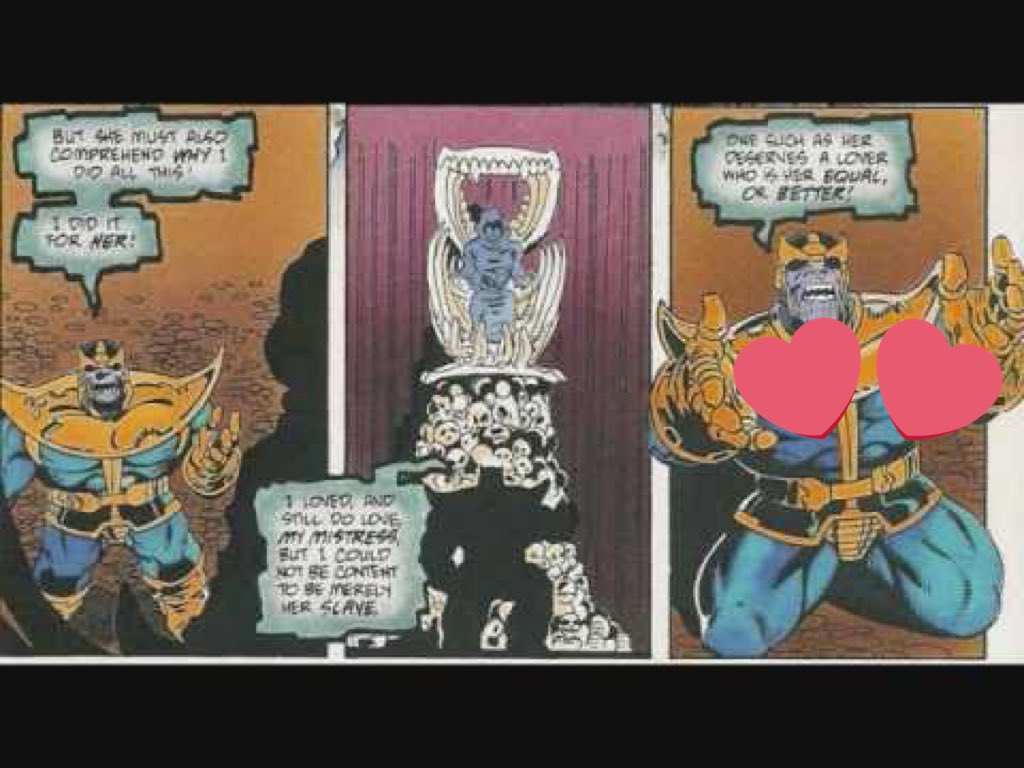 But in the source material, Thanos *did it all for love*. [ I have a hard time reading the below panel without spontaneously humming Peter Cetera’s, "Glory of Love" ] https://twitter.com/micsolana/status/1204528814337847296 …pic.twitter.com/SzpCnXMMl6