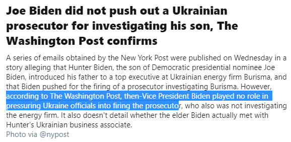 So you’re response to me saying the entire premise of your article is based off of an objective falsehood/ lie (that joe got the prosecutor fired bc he was looking into hunter and burisma) was to respond by saying Twitter once incorrectly summarized a Wapo article?