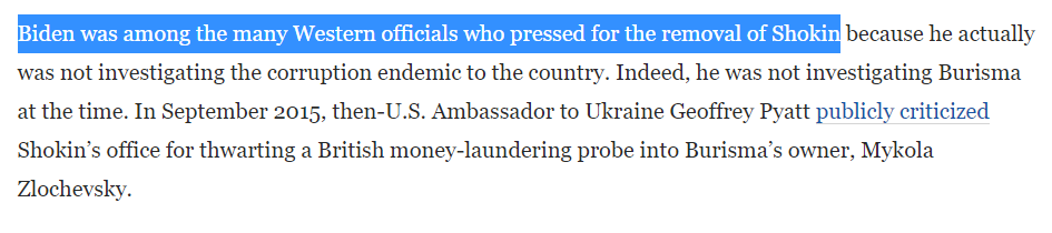 “Biden, while serving as Vice President, pressured the Ukrainian government into firing a prosecutor investigating that same company.” Is a known falsehood/lie. Rs, Ds and foreign govs all agreed the prosecutor needed to be fired bc of his lack of investigating corruption.