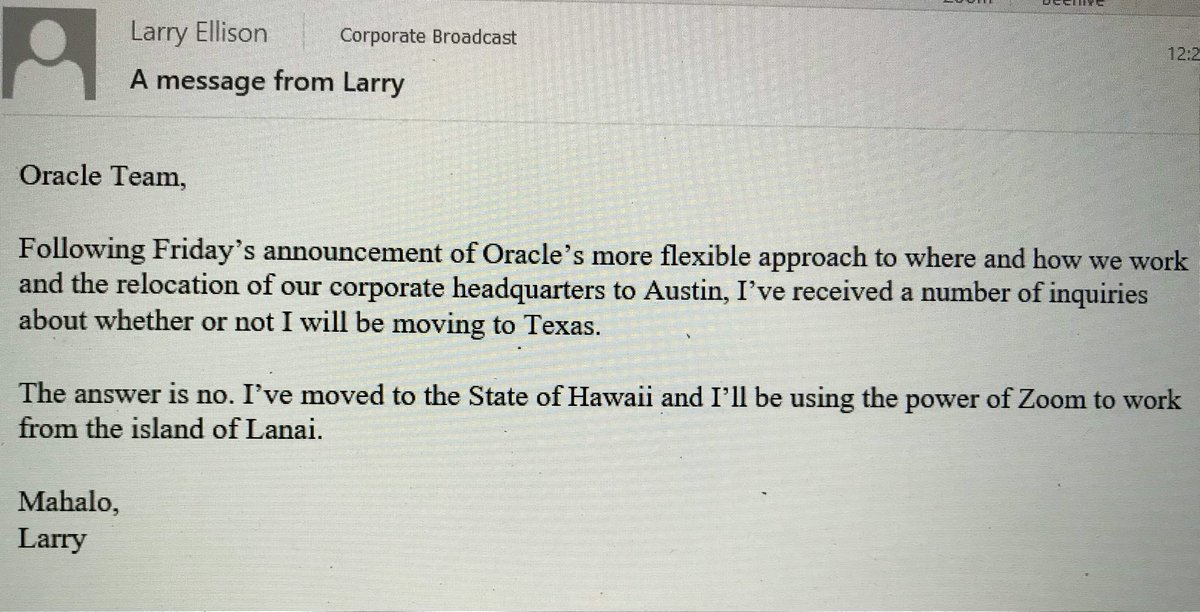 Can we just take a minute to digest that this is a real email? basically: 'many of you wonder if I will move with the corporation. No. I'm moving to my private island in hawaii. Mahalo, Larry"https://twitter.com/jrichlive/status/1338575659036147712 …
