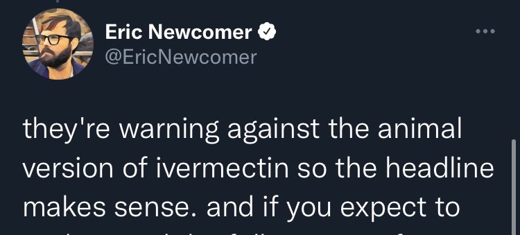 the fair critique is about the jokes on twitter but it's more appealing to write it about the authorities. even the FDA post seems pretty thoughtful and acknowledges human useshttps://www.fda.gov/consumers/consumer-updates/why-you-should-not-use-ivermectin-treat-or-prevent-covid-19 …