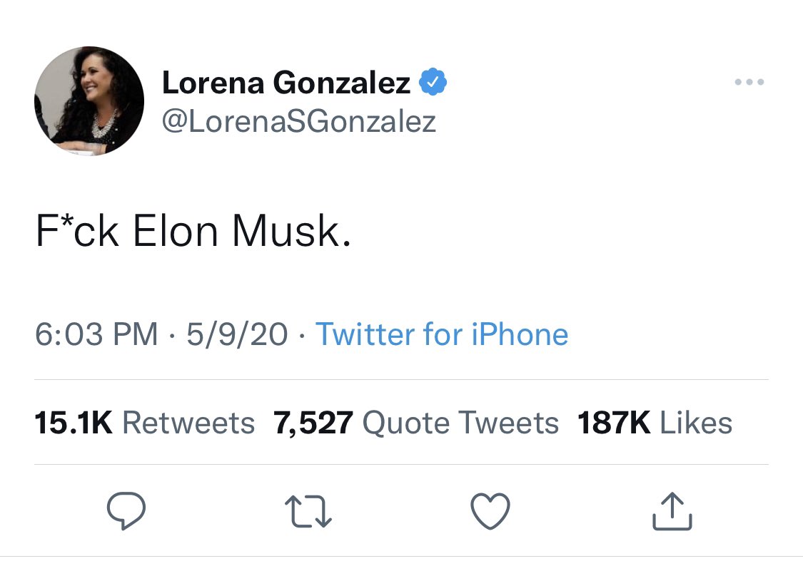 Looks like Elon’s tweet at 5.15pm precedes Lorena’s tweet at 6.03pm Maybe tweeting from different time zones?