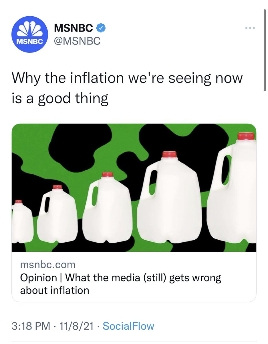Another for posterity. Inflation is good for everyone except "the kinds of people who own corporate news outlets - or... coal firms". (Forget rent, and non-milk appreciation, all imaginary). And forget all our propublica reshares on billionaires & debthttps://theintercept.com/2021/11/10/inflation-economy-debt-milk-prices/?utm_medium=email&utm_source=The%20Intercept%20Newsletter …