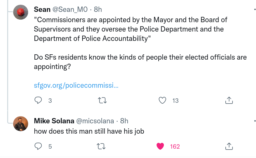 Racist SF police commissioner lobbing completely unhinged slurs at me. You need to be removed. It’s an embarrassment to our city.
