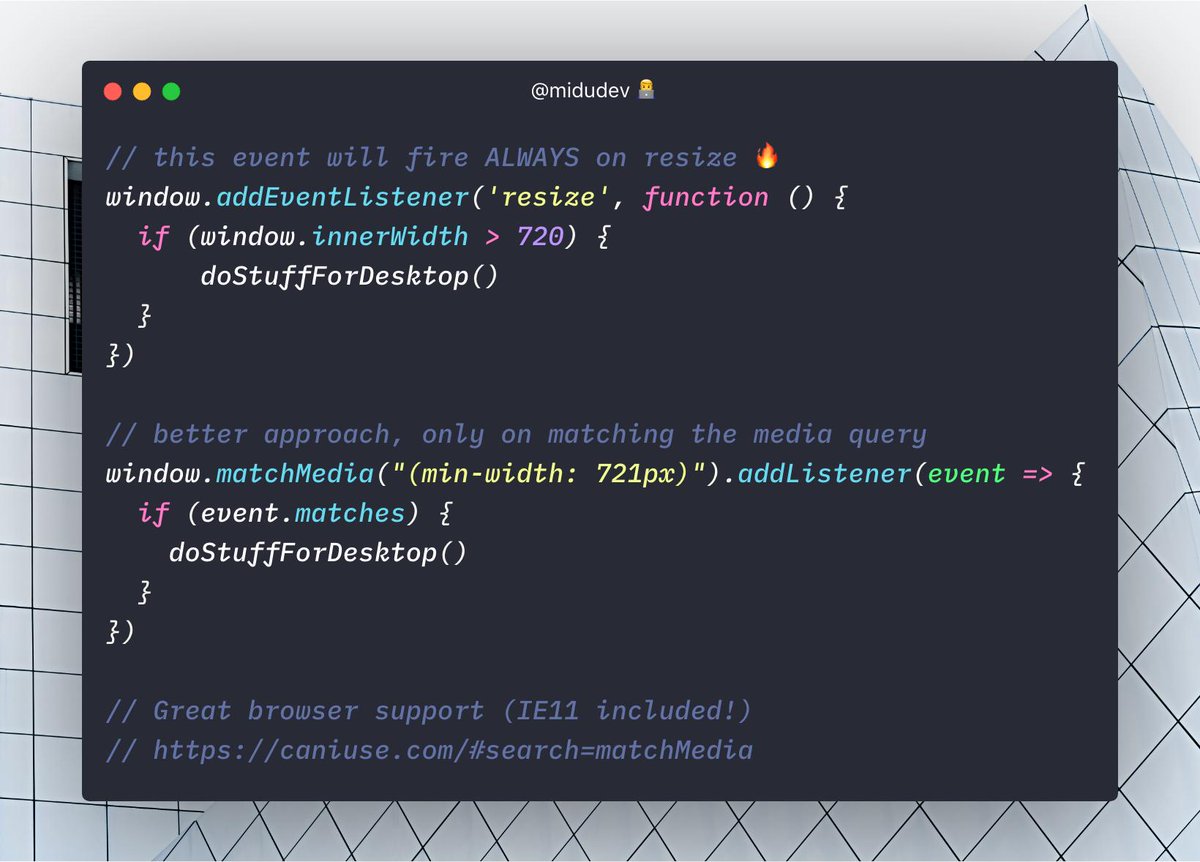 el evento 'resize' para hacer tareas en Javascript dependiendo del tamaño de la ventana... puede ser interesante usar la función matchMedia para evitar afectar tanto la performance