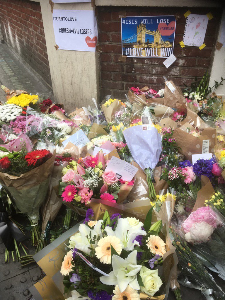 Op hoek Borough High street en Union street stapelen de bloemenpakktten zich op. Borough Market nog steeds afgeslotenpic.twitter.com/WJAki2IkpP