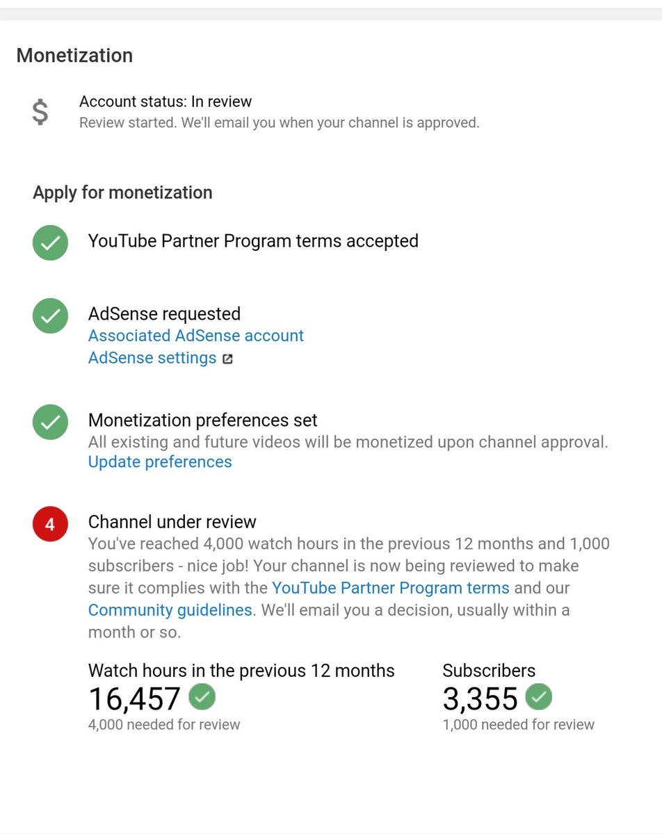 @TeamYouTube Hi Dear Youtube I have completed 4000 hours watch time and 1000 subscribers for monetization as per youtube polices in previous 365 days.