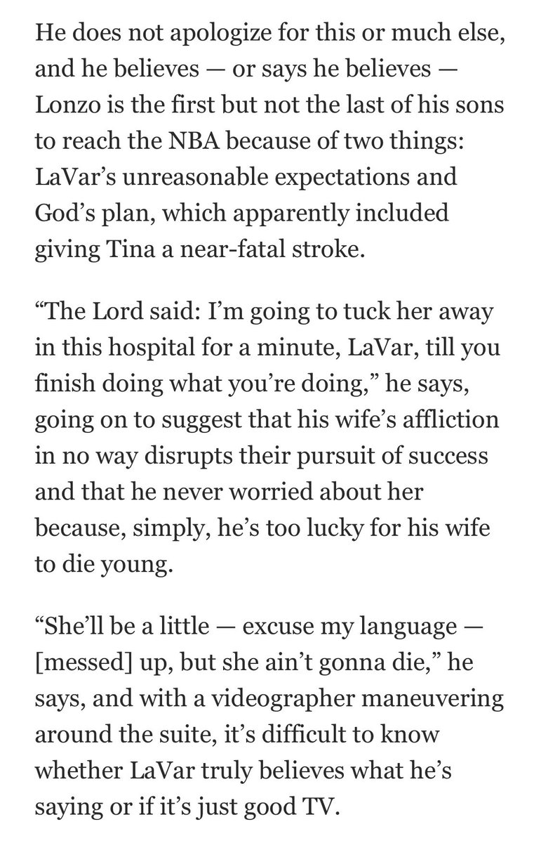 This is a remarkable, sad story. I can’t imagine this kind of cruelty & insensitivity about anyone, not to mention your wife. http://www.washingtonpost.com/news/sports/wp/2018/06/14/feature/lavar-balls-wifes-quiet-recovery/ …pic.twitter.com/xLXg7DGp1l