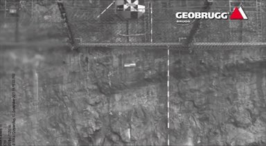 Notice: rock net drape (back), boots (top), drainage holes (bottom right), collection ditch (base)