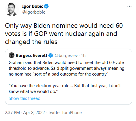 It's actually even harder than that. Just because a Republican would support a nominee wouldn't mean they would vote to override McConnell's control of the floor.https://twitter.com/KDbyProxy/status/1512519980386070530 …