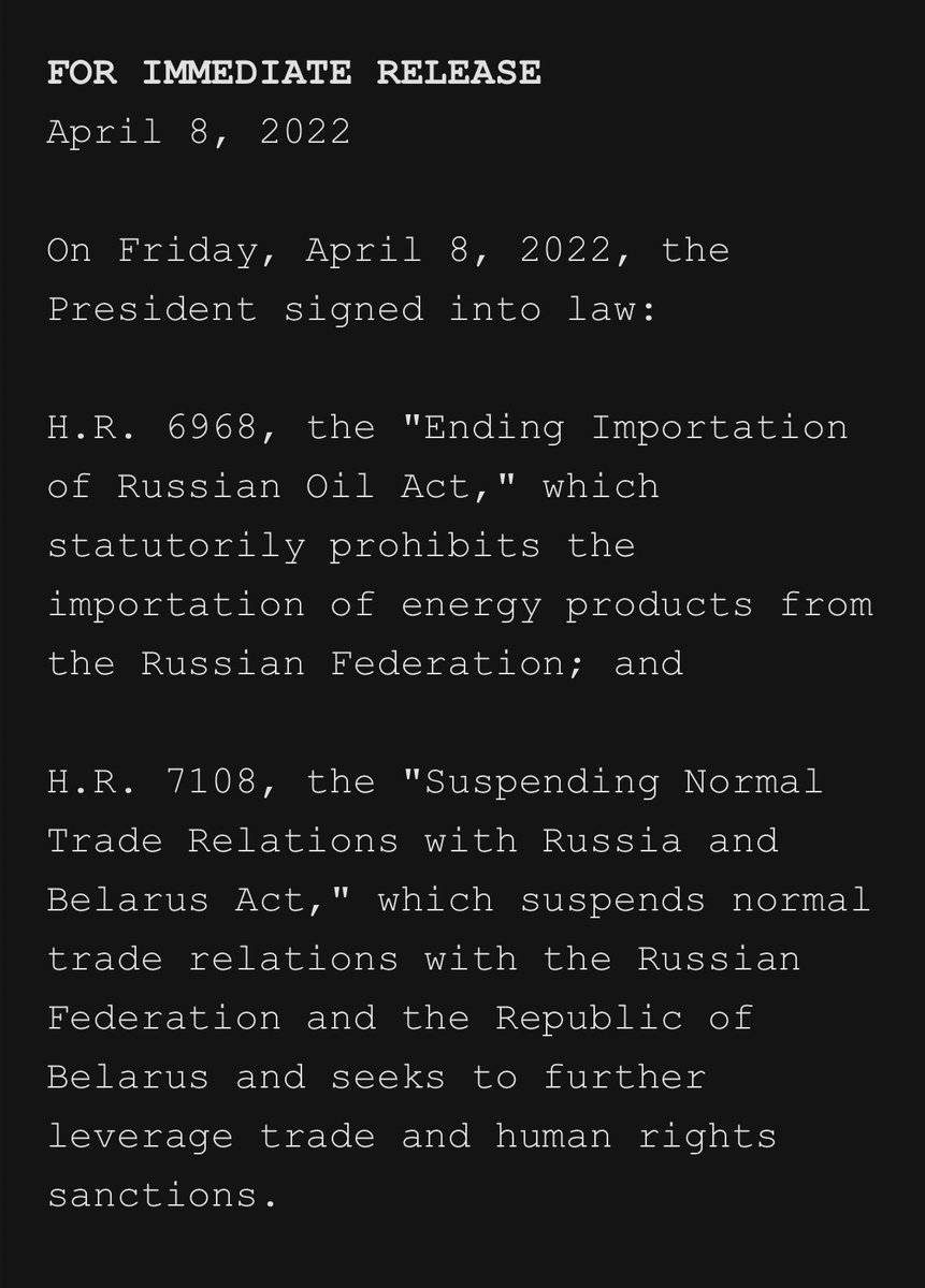 Just in: Biden signs legislation cutting off Russian oil imports and suspending normal trade relations with Russia and Belarus. Both passed 100-0 in the Senate yesterday and with just a handful of “no” votes in the House.pic.twitter.com/30YDsfoGcX