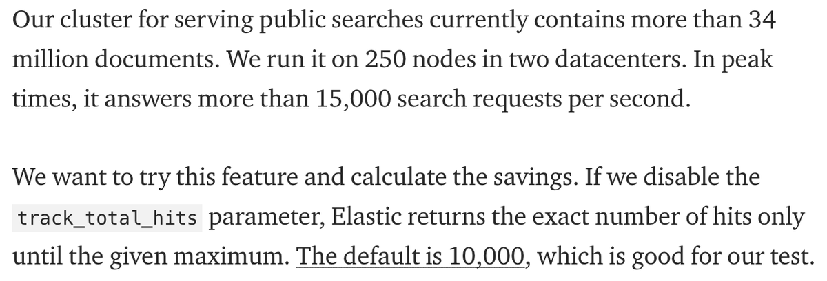 eBay Kleinanzeigen is saving 20% response time by getting rid of the total hits in Elasticsearch 7 (the magic WAND — on by default): https://ebaytech.berlin/stop-tracking-total-hits-2f63bb5fb6f5 … that's a nice saving and nobody will care for the exact count of results once you hit more than 10,000pic.twitter.com/IDg77MRhcZ