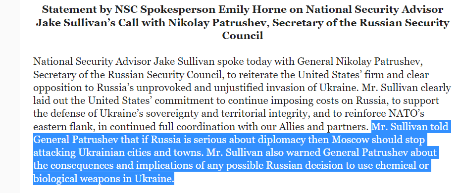 US to Russia: 1) Stop bombing Ukraine to show you're serious about diplomacy 2) You'd better not use chemical/biological weapons in Ukraine. Curious to see the Russian summary, if there is one.pic.twitter.com/zWhelbTy6D